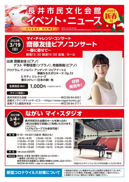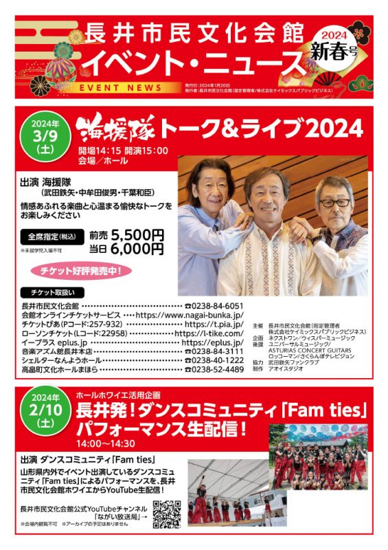 長井市民文化会館「イベント・ニュース」は主な公演情報や講座情報が載っています。
